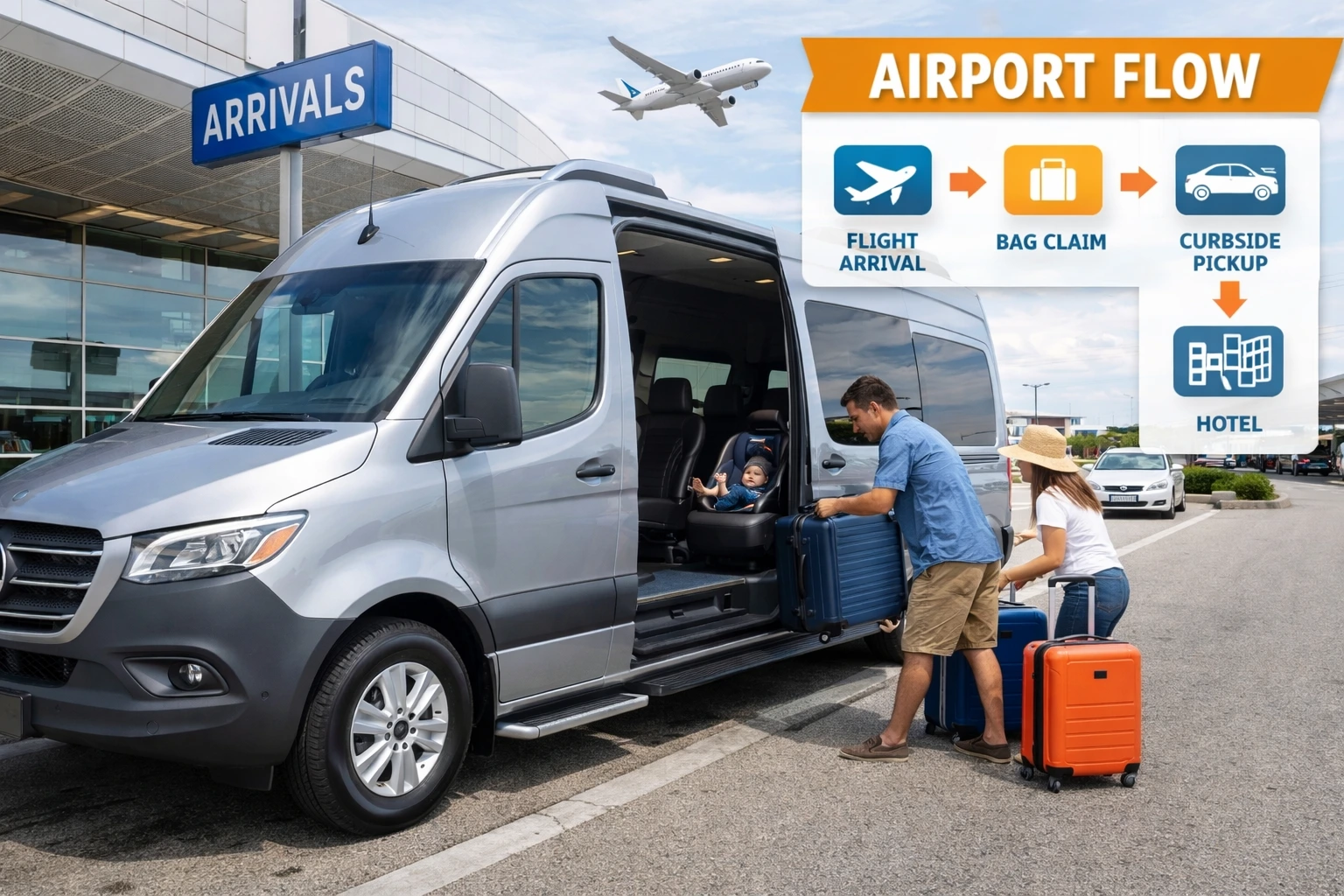 For families, business teams, wedding parties, friend groups, or travelers carrying a lot of luggage, the problem is not just getting from the airport to the next destination. The real challenge is keeping the group organized without splitting cars, waiting in the wrong zone, or dealing with curbside chaos after a long flight.